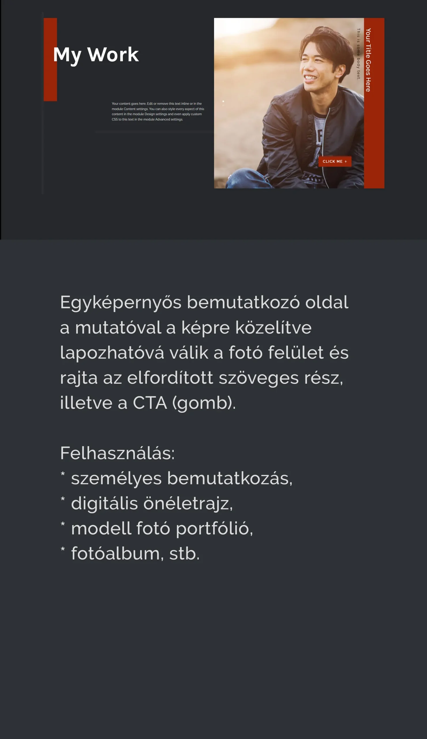 ⇒ egyoldalas, esetleg egy aloldallal (pl.: célirányos űrlap, katalógus, ÁSZF, stb.), belső horgonyos navigációval ellátott menüsorral és CTA-kkal (Call to Action) rendelkező, szolgáltatást, kínálatot, portfóliót bemutató webhelyek — mint: sofőr, biztosítás, egyes építőipari szegmensek, tájékoztató
